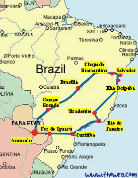 I spent two months backpacking round Brasil on my own and it was fantastic. I travelled by coach and totalled up over 100 hours of travel time during my round trip. Having set off from Asuncion in Paraguay, I first headed for the Pantanal, then followed a northely route up to Salvador de Bahia, passing through Brasilia and the Chapada Diamantina on the way. From Salvador, I loosely followed the coast back down to Rio do Janeiro with a couple of Dutch friends whom I met on the way. We visited the state of Minas Gergais on the way down, and rounded up the tour with a stop off at the Iguazu falls.